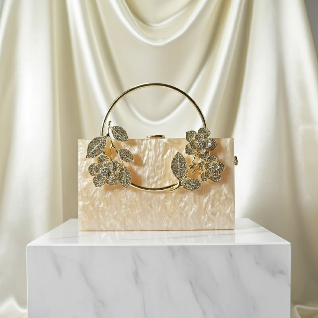 Ce sac de soirée n'est pas qu'un simple accessoire, c'est une véritable pièce de joaillerie pour sublimer votre tenue. Son acrylique perlescent capte la lumière de façon magique, tandis que ses motifs floraux ajoutent une touche de délicatesse. Compact (19x11x4.5cm) mais spacieux, il contient tous vos essentiels de soirée avec élégance.
